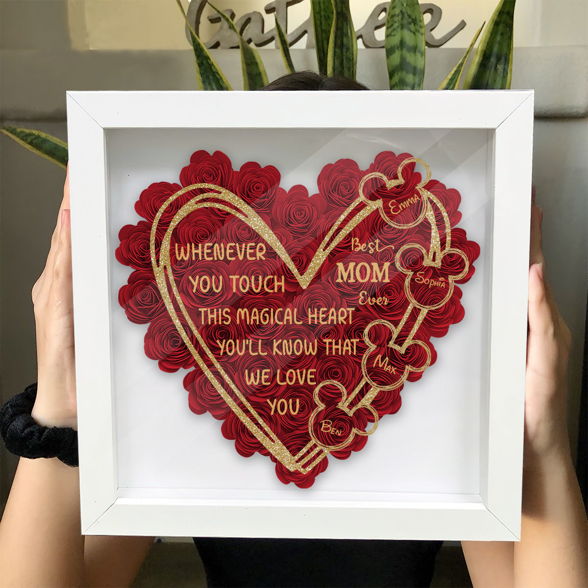 This heart-shaped flower shadow box contains hand-rolled PE foam flowers in various shades.