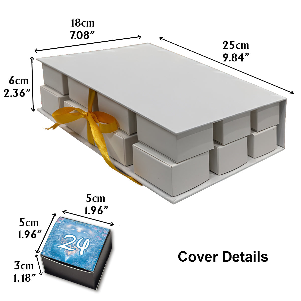 - 24 Mini Drawers – Each box measures 5×5×3cm (1.97"×1.97"×1.18"), fully printed on the top and sides with vibrant designs. Perfect for hiding ornaments, candies, or small surprises.